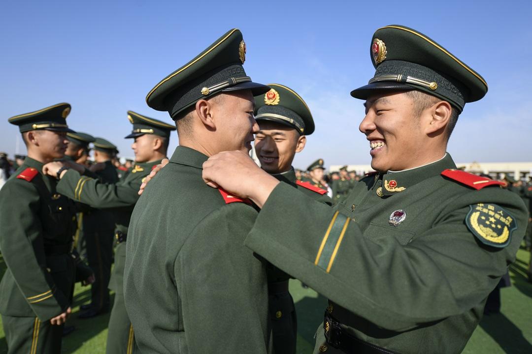 圖為一名新兵的妹妹給哥哥戴警銜。