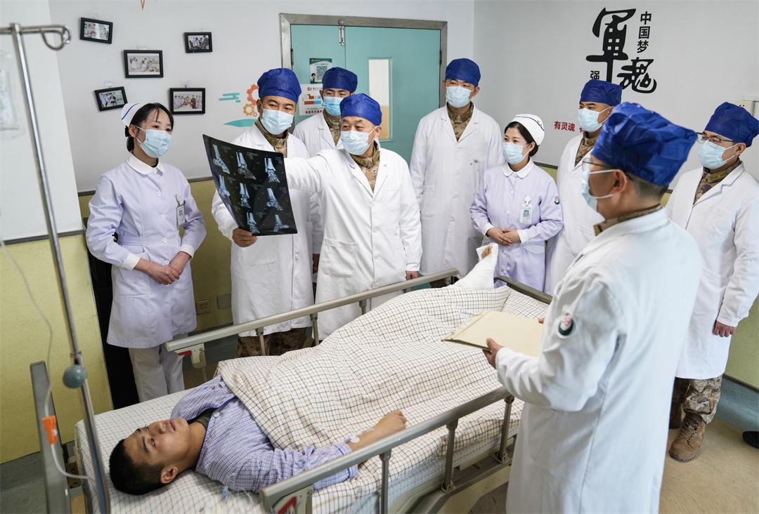 圖為博士團(tuán)隊(duì)在病房里為戰(zhàn)士會診,研究軍事訓(xùn)練傷防治。張永進(jìn) 攝
