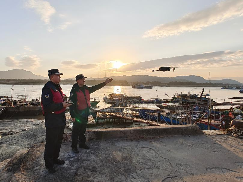 圖為海警執(zhí)法員利用無人機(jī)對(duì)轄區(qū)漁港岙口進(jìn)行巡查。袁冠卿 攝