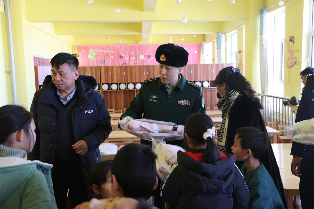 圖為布和圖木爾(中)為學(xué)生獻(xiàn)愛心。