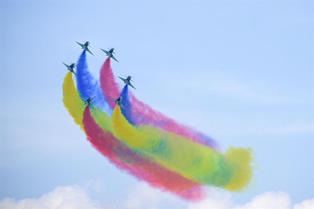 13時許,噴涂中國國旗和八一軍徽的表演機抵達樟宜展覽中心海面上空,率先編成超密集六機大箭隊,在空中拉出紅、黃、藍3種顏色6道彩煙,以低空通場形式展現(xiàn)特殊禮儀,用“彩虹”向各國來賓致以最真摯的問候。
