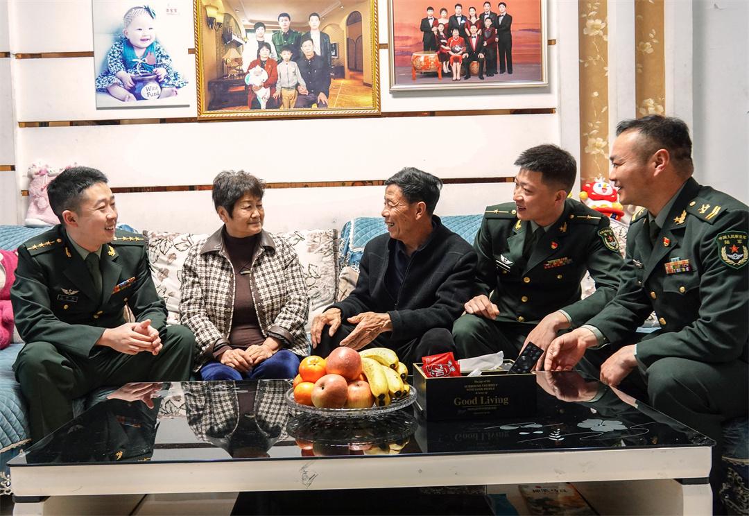 圖為部隊(duì)官兵來到申亮亮家中看望英雄父母,與老人親切交談。