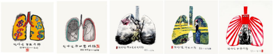 在舒勇“每日一畫”創(chuàng)造的眾多意象中,《同呼吸共命運》系列大概是最簡單至極的表達(dá)。作品運用“肺”的基本形態(tài)作為背景容器,將世界各國著名藝術(shù)家作品及思想融進(jìn)了這個基本形態(tài)的肺容器中。以此來表達(dá),我們雖然生活在不同的地方,來自不同的國家,擁有不同的膚色、不同的文化,但是我們有同樣的肺,呼吸在同一片藍(lán)天下。