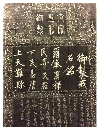 孟昶的《官箴》文筆顯然優(yōu)美,但內(nèi)容深?yuàn)W難懂。因此,宋太宗趙光義即位后,摘取了其中“爾俸爾祿,民膏民脂。下民易虐,上天難欺”四句,并親筆書(shū)寫(xiě),頒行天下,“以賜郡國(guó),立于廳事之南,謂之《戒石銘》”。這就是后世通行的《戒石銘》。而頒布《戒石銘》目的,就是“使守令僚佐觸目警心,務(wù)求為良吏”。