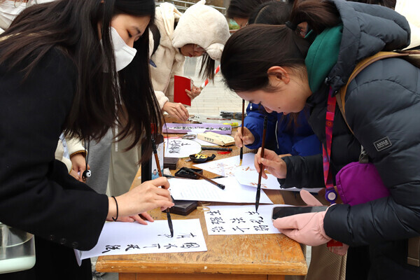 同一天,主題活動在清華大學(xué)學(xué)生服務(wù)中心前舉辦?;顒油ㄟ^限時背誦憲法名言、法律知識問答等游戲方式,向師生普及憲法,引導(dǎo)學(xué)習(xí)憲法。現(xiàn)場設(shè)計了“想點(diǎn)大事”“三行情書”“與法同行”“現(xiàn)身‘書法’”等活動,鼓勵師生們以筆書寫憲法意,以心感悟憲法情?,F(xiàn)場還準(zhǔn)備了帶有宣傳法治內(nèi)容的小夜燈、筆記本、卡套、文件夾等文創(chuàng)獎品。