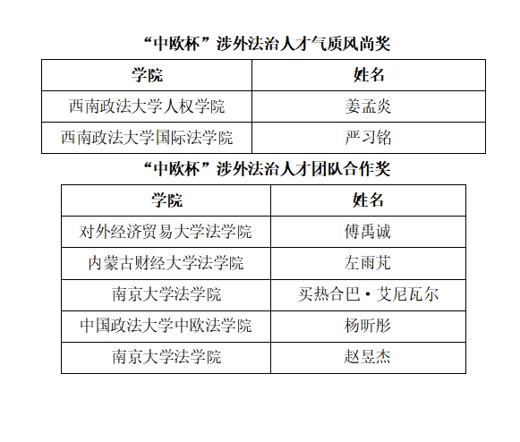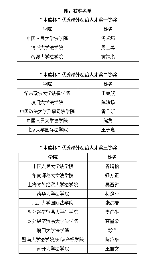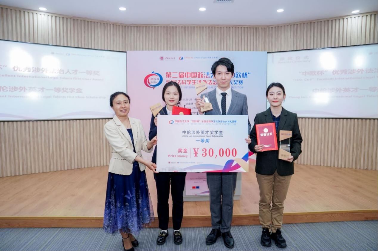 經(jīng)過激烈角逐,最終,中國人民大學(xué)湯卓筠、清華大學(xué)周士尊、湘潭大學(xué)黃靖淼3名選手榮獲“中歐杯”優(yōu)秀涉外法治人才一等獎(jiǎng)。另有22名選手分別獲“中歐杯”優(yōu)秀涉外法治人才二等獎(jiǎng)、三等獎(jiǎng)、“涉外法治人才氣質(zhì)風(fēng)尚獎(jiǎng)”“涉外法治人才團(tuán)隊(duì)合作獎(jiǎng)”等。在5月26日下午舉行的閉幕式暨頒獎(jiǎng)儀式上,中國政法大學(xué)黨委副書記王立艷、中倫律師事務(wù)所高級顧問王霽虹等為選手頒獎(jiǎng)。獲獎(jiǎng)同學(xué)同時(shí)獲得“中倫涉外英才獎(jiǎng)學(xué)金”。