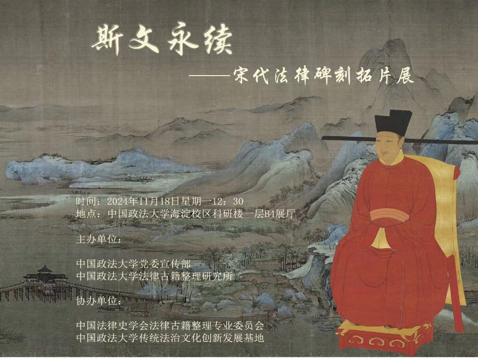 2024年11月18日,“斯文永續(xù)——宋代法律碑刻拓片展”在中國政法大學(xué)海淀校區(qū)開幕。本次展覽由中國政法大學(xué)黨委宣傳部、中國政法大學(xué)法律古籍整理研究所主辦,中國法律史學(xué)會(huì)法律古籍整理專業(yè)委員會(huì)、中國政法大學(xué)傳統(tǒng)法治文化創(chuàng)新發(fā)展基地協(xié)辦。這是自2017年以來中國政法大學(xué)舉辦第13場(chǎng)法制文物學(xué)術(shù)公益展覽。