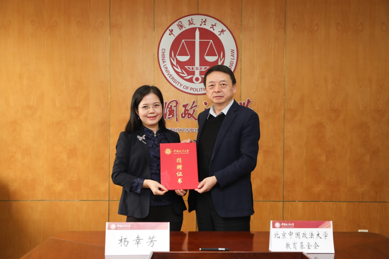 盧春龍代表中國(guó)政法大學(xué)和楊幸芳簽署捐贈(zèng)協(xié)議,馬懷德代表中國(guó)政法大學(xué)向楊幸芳頒發(fā)捐贈(zèng)證書。