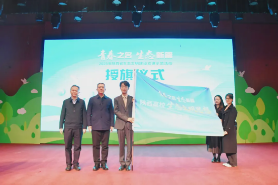 西北政法大學(xué)黨委書(shū)記趙萬(wàn)東、陜西省生態(tài)環(huán)境廳黨組成員、副廳長(zhǎng)吳忠濤為高校生態(tài)文明思想宣講團(tuán)學(xué)生代表授旗