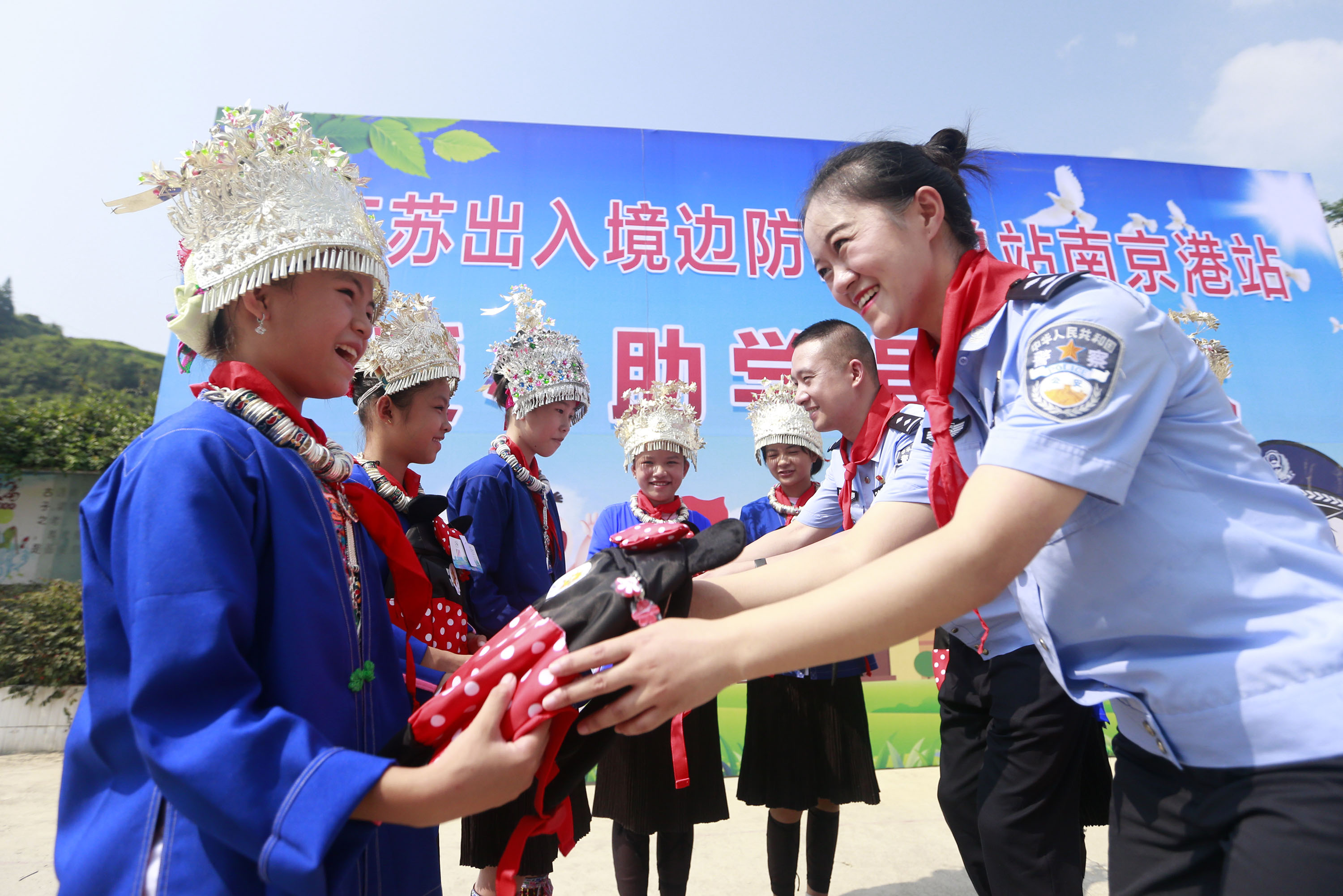 8月25日,在新學(xué)期開學(xué)之際,廣西壯族自治區(qū)柳州市三江侗族自治縣獨(dú)峒鎮(zhèn)八協(xié)小學(xué)的貧困學(xué)生領(lǐng)到了愛心書包。當(dāng)日,江蘇南京港出入境邊防檢查站民警和企業(yè)代表來(lái)到八協(xié)小學(xué)開展愛國(guó)主義教育和愛心助學(xué)捐贈(zèng)儀式主題活動(dòng),為全體學(xué)生精心準(zhǔn)備了書包、學(xué)習(xí)用品、文體器材、衣物等禮物300套,讓孩子們開心快樂(lè)迎接新學(xué)期到來(lái)。