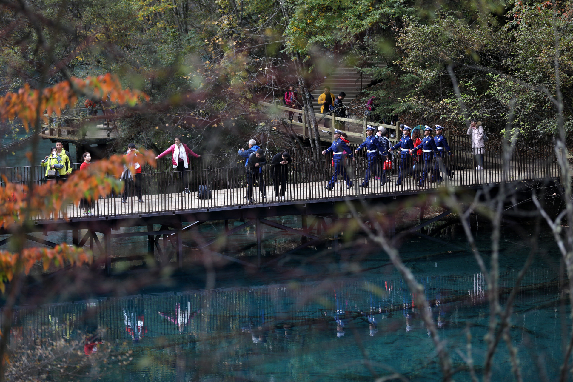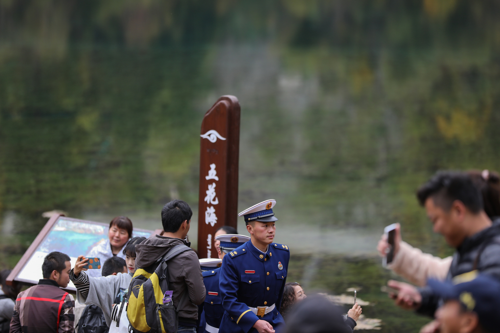 澤汪塔像往常一樣出現(xiàn)在景區(qū)的棧道上,他和隊(duì)友巡邏在游客最多的長(zhǎng)海和五彩池附近,擔(dān)負(fù)著周邊的森林防火工作和游客安全。