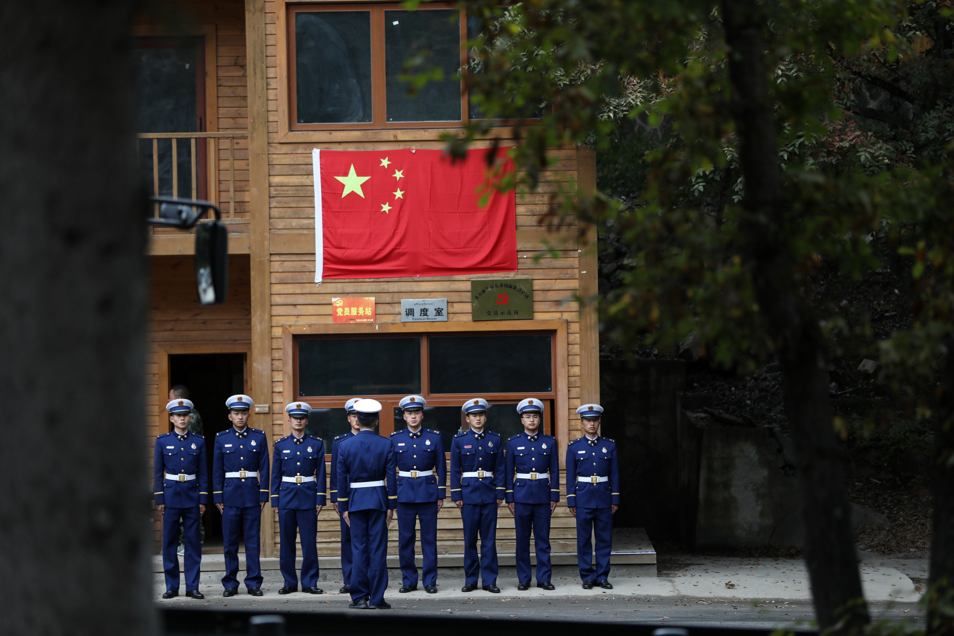 隊(duì)員們?cè)诰皡^(qū)調(diào)度室門前集合出發(fā)。