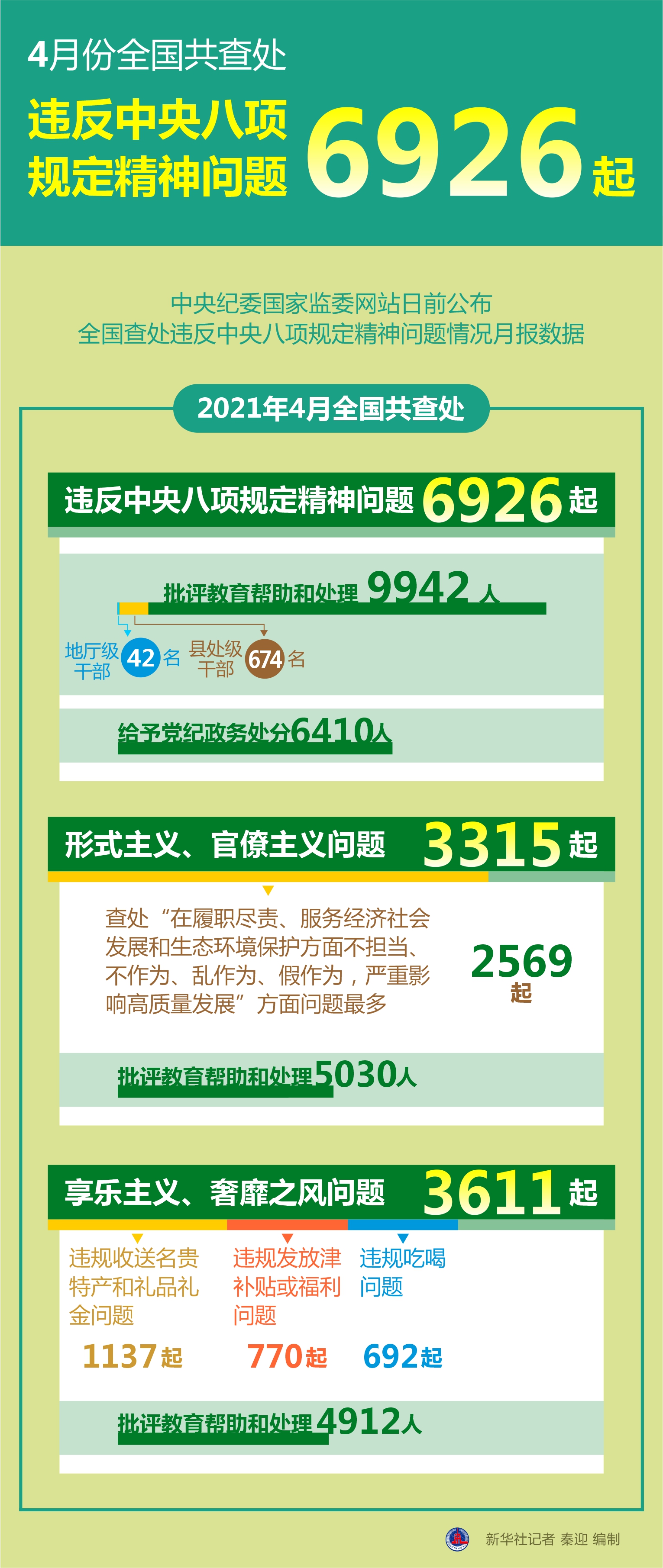 4月份全國共查處違反中央八項規(guī)定精神問題6926起