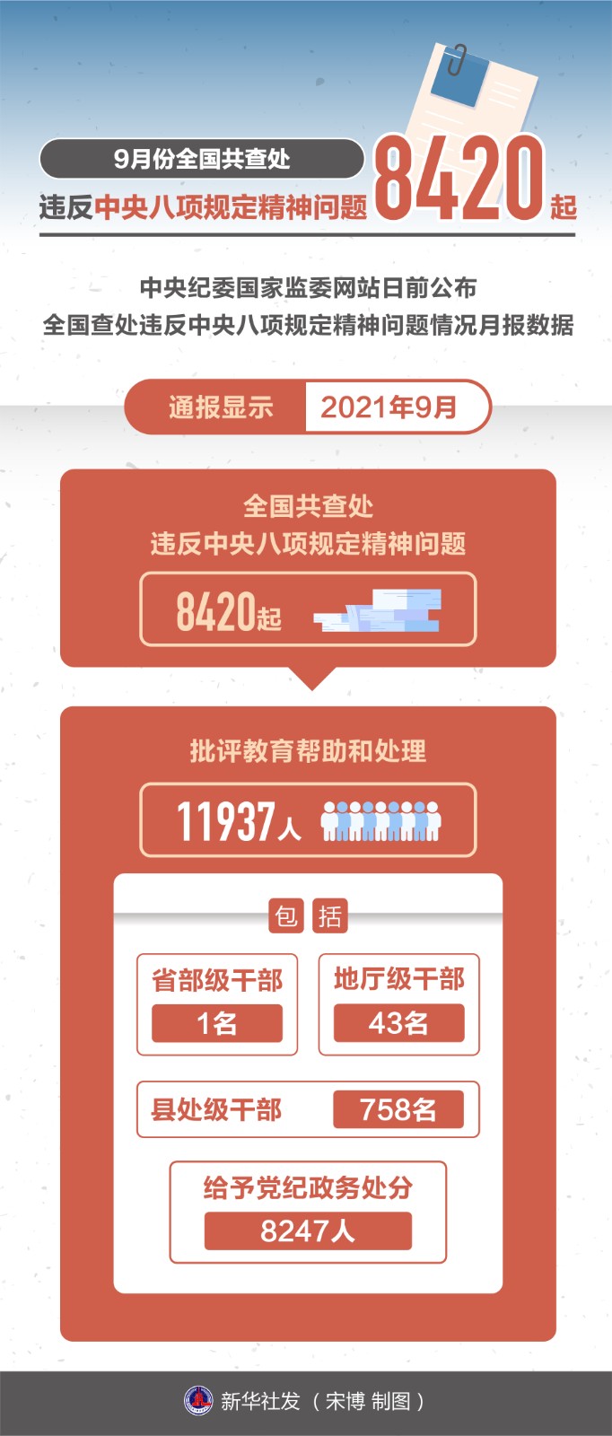 中央紀(jì)委國家監(jiān)委網(wǎng)站日前公布全國查處違反中央八項(xiàng)規(guī)定精神問題情況月報(bào)數(shù)據(jù)。通報(bào)顯示,2021年9月,全國共查處違反中央八項(xiàng)規(guī)定精神問題8420起,批評(píng)教育幫助和處理11937人(包括1名省部級(jí)干部、43名地廳級(jí)干部、758名縣處級(jí)干部),給予黨紀(jì)政務(wù)處分8247人。
