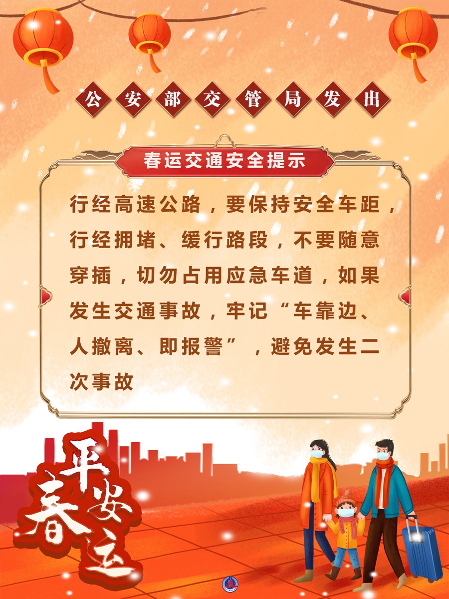 2022年春運(yùn)于1月17日開始。公安部交管局發(fā)出春運(yùn)交通安全提示:重點(diǎn)時(shí)段出行集中,低溫雨雪天氣多發(fā),需高度重視道路交通安全。