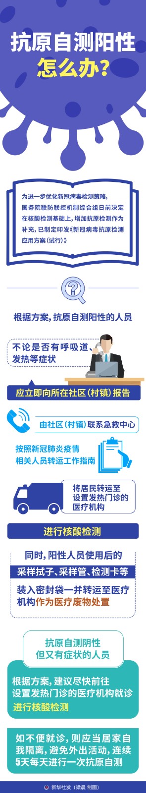 根據(jù)方案,抗原自測陽性的人員,不論是否有呼吸道、發(fā)熱等癥狀,應(yīng)立即向所在社區(qū)(村鎮(zhèn))報告,由社區(qū)(村鎮(zhèn))聯(lián)系急救中心按照新冠肺炎疫情相關(guān)人員轉(zhuǎn)運(yùn)工作指南,將居民轉(zhuǎn)運(yùn)至設(shè)置發(fā)熱門診的醫(yī)療機(jī)構(gòu),進(jìn)行核酸檢測。
