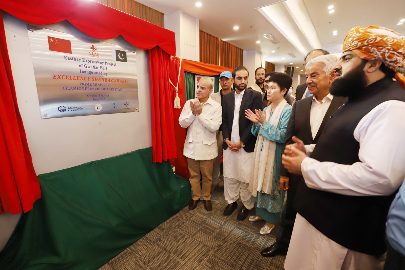 6月3日,在巴基斯坦西南部俾路支省瓜達爾,巴基斯坦總理夏巴茲·謝里夫(左一)為瓜達爾東灣快速路通車揭牌。