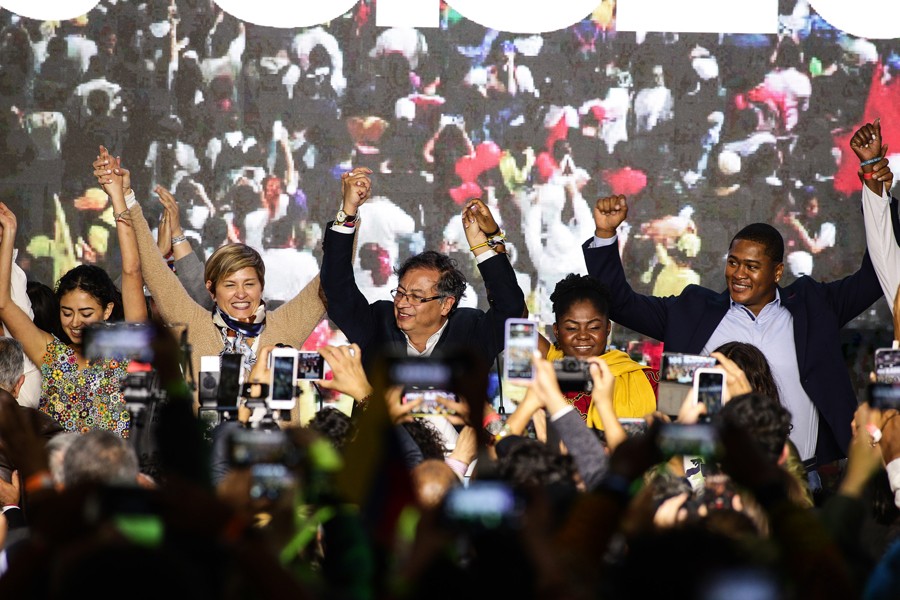 5月29日,在哥倫比亞波哥大,左翼競選聯(lián)盟“哥倫比亞歷史公約聯(lián)盟”候選人古斯塔沃·佩特羅(中)慶祝在總統(tǒng)選舉首輪投票中得票領先。