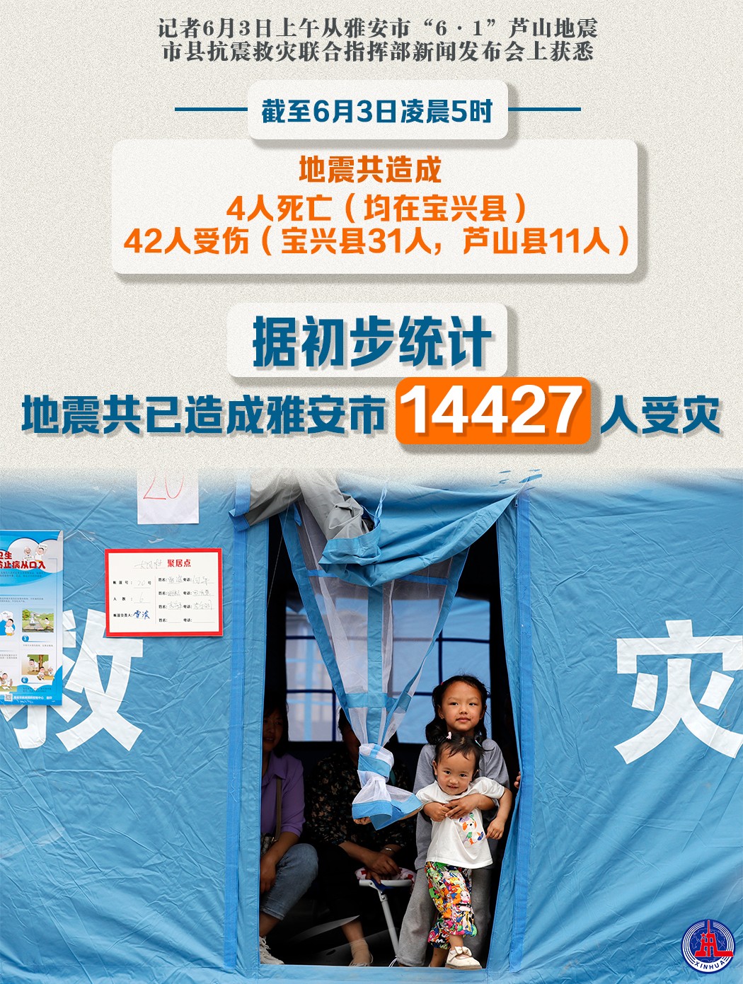 記者6月3日上午從雅安市“6·1”蘆山地震市縣抗震救災(zāi)聯(lián)合指揮部新聞發(fā)布會(huì)上獲悉,截至6月3日凌晨5時(shí),地震共造成4人死亡(均在寶興縣)、42人受傷(寶興縣31人,蘆山縣11人)。據(jù)初步統(tǒng)計(jì),地震共已造成雅安市14427人受災(zāi)。