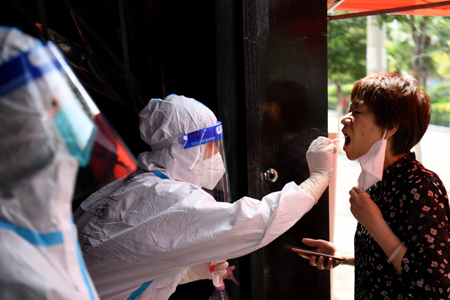 7月3日,在安徽省宿州市泗縣虹城街道東關(guān)社區(qū),醫(yī)務(wù)人員為居民進行核酸采樣。