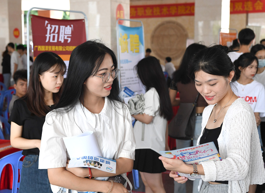 7月2日,廣西國(guó)際商務(wù)職業(yè)技術(shù)學(xué)院學(xué)生在校園雙選會(huì)上求職。