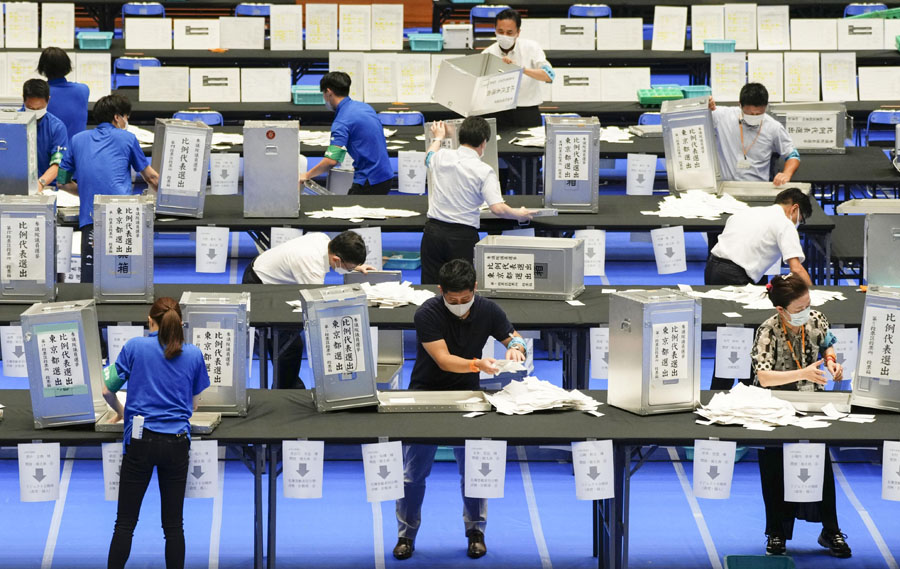 7月10日,工作人員在日本東京港區(qū)體育中心進行參議院選舉投票開票作業(yè)。