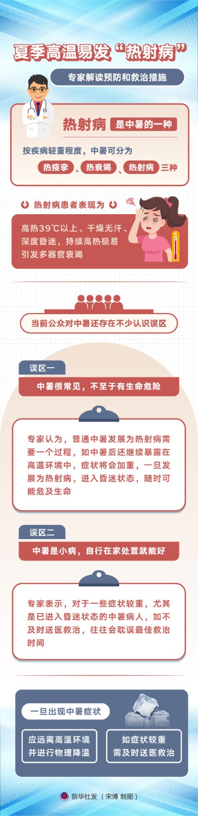連日來,南方多地持續(xù)高溫。熱浪來襲,多地已有多人確診熱射病。專家介紹,隨著生產(chǎn)生活條件改善和公眾防范意識增強,其實近年來醫(yī)院接診熱射病人數(shù)不斷減少,但仍需警惕極端高溫條件下熱射病患者增多,以及普通中暑患者因處理不當而發(fā)展成熱射病病人的情況。