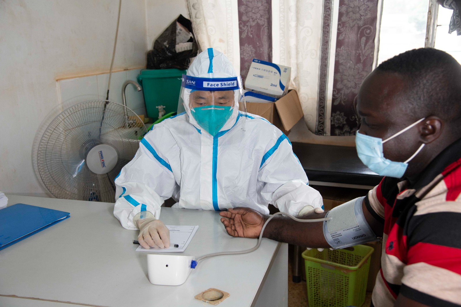 6月9日,在中非共和國首都班吉,中國醫(yī)療隊(duì)醫(yī)生為病人測血壓。