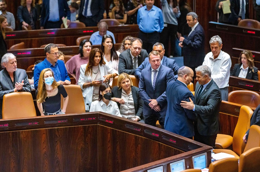 6月30日,在位于耶路撒冷的以色列議會,貝內特(前右二)和拉皮德(前右一)參加議會全會。