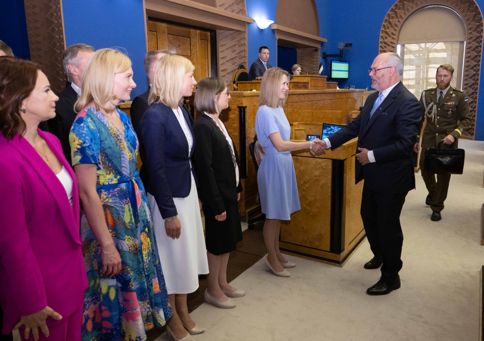 7月18日,在愛沙尼亞首都塔林,愛沙尼亞總統(tǒng)卡里斯(右二)在議會與愛沙尼亞總理、改革黨主席卡婭·卡拉斯(右三)握手,祝賀新聯(lián)合政府成立。