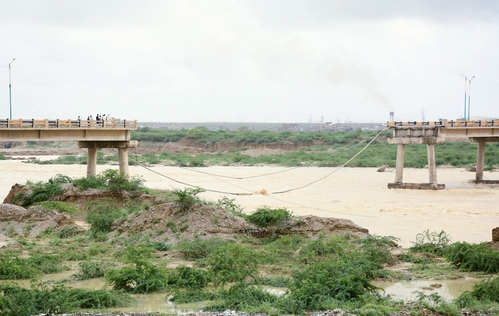 這是7月26日在巴基斯坦卡拉奇拍攝的在洪水中損毀的橋梁。