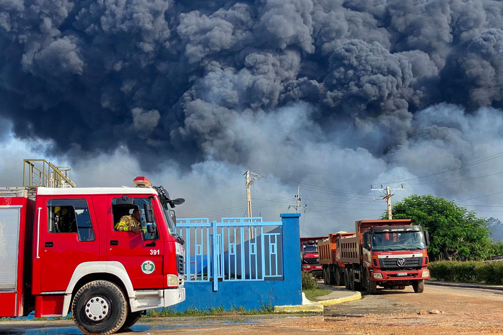 8月8日,在古巴馬坦薩斯省,救援車輛停在火災(zāi)現(xiàn)場(chǎng)附近。