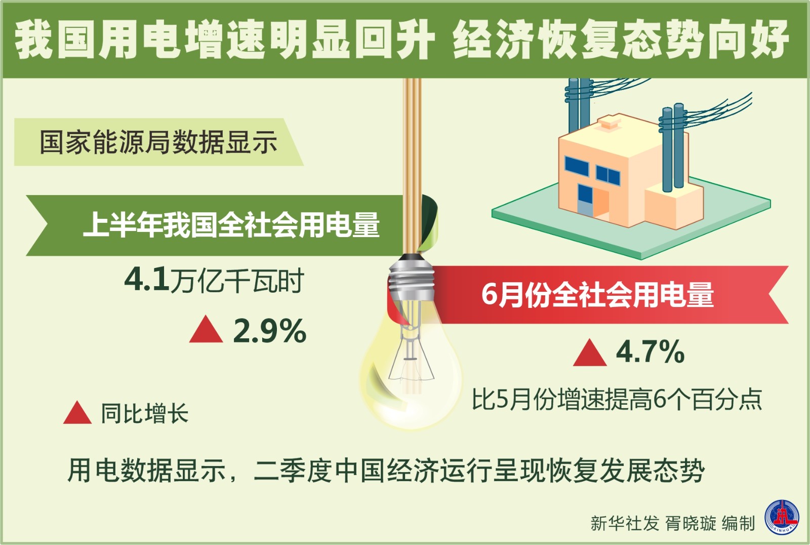 國家能源局數(shù)據(jù)顯示,上半年我國全社會用電量4.1萬億千瓦時,同比增長2.9%。6月份全社會用電量同比增長4.7%,比5月份增速提高6個百分點。用電數(shù)據(jù)顯示,二季度中國經(jīng)濟運行呈現(xiàn)恢復發(fā)展態(tài)勢。