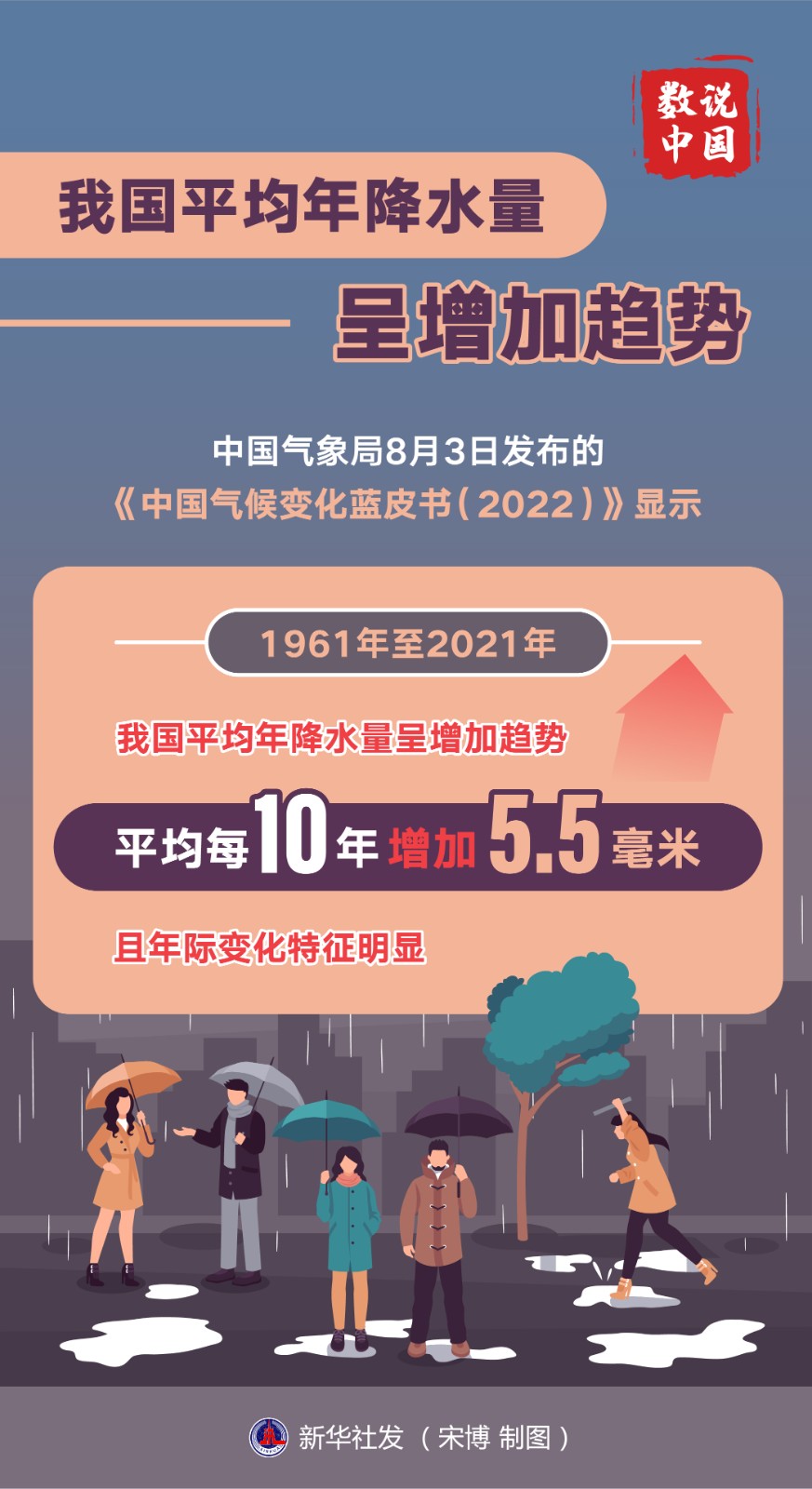 中國氣象局8月3日發(fā)布的《中國氣候變化藍(lán)皮書(2022)》顯示,1961年至2021年,我國平均年降水量呈增加趨勢,平均每10年增加5.5毫米,且年際變化特征明顯。