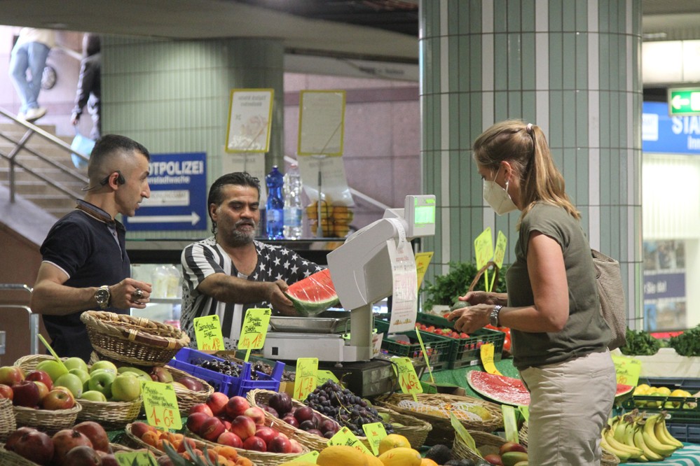 8月2日,顧客在德國法蘭克福一家攤位前購買水果。
