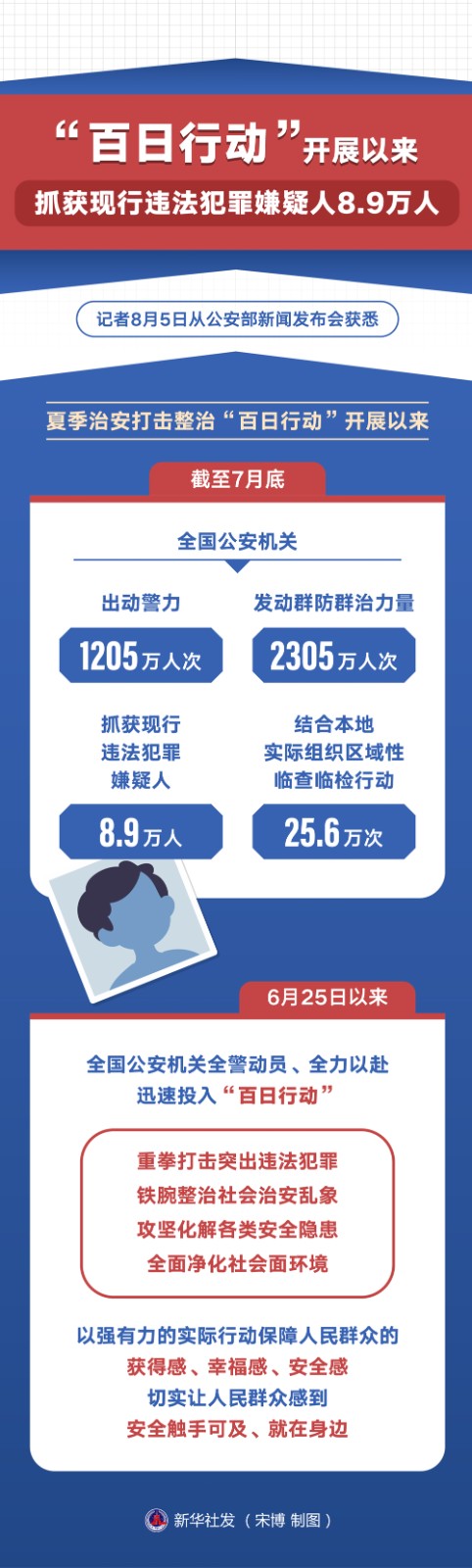 記者8月5日從公安部新聞發(fā)布會(huì)獲悉,夏季治安打擊整治“百日行動(dòng)”開(kāi)展以來(lái),截至7月底,全國(guó)公安機(jī)關(guān)出動(dòng)警力1205萬(wàn)人次,發(fā)動(dòng)群防群治力量2305萬(wàn)人次,抓獲現(xiàn)行違法犯罪嫌疑人8.9萬(wàn)人,結(jié)合本地實(shí)際組織區(qū)域性臨查臨檢行動(dòng)25.6萬(wàn)次。
