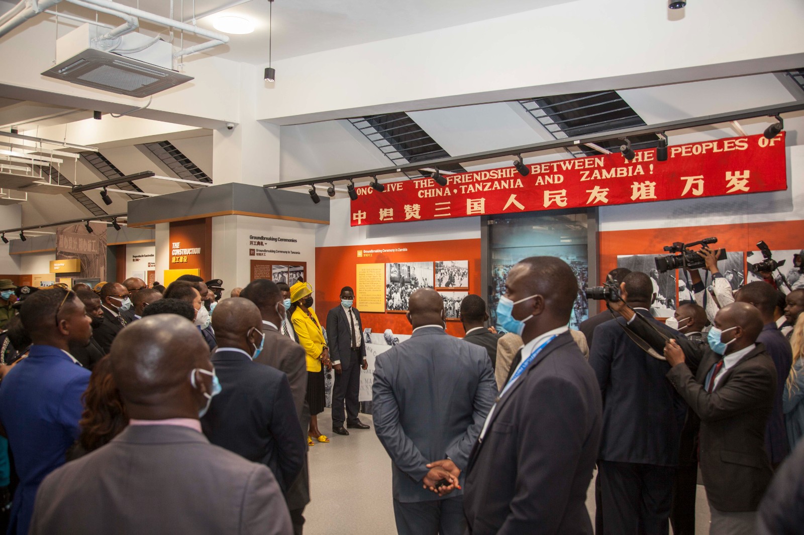 8月10日,在贊比亞盧薩卡省瓊圭地區(qū),來賓參觀坦贊鐵路紀(jì)念園內(nèi)的紀(jì)念館。