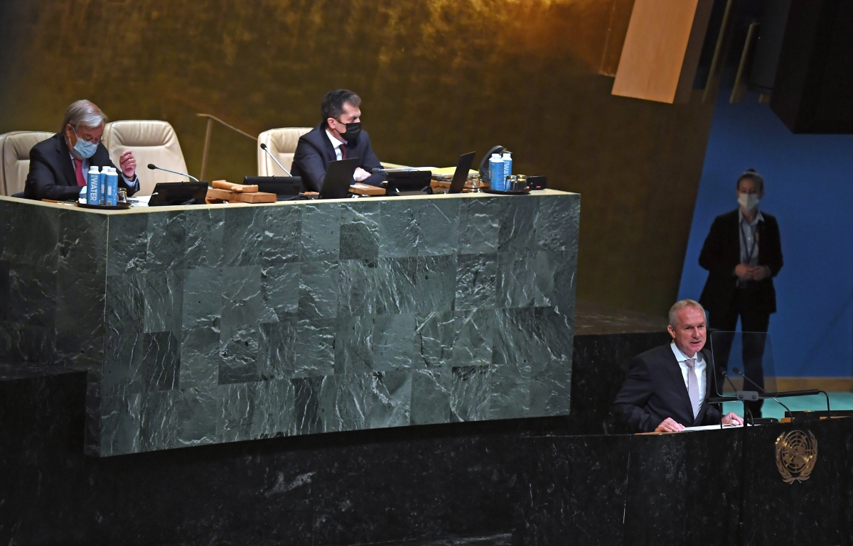 9月20日,在位于紐約的聯(lián)合國總部,第77屆聯(lián)合國大會(huì)主席克勒希(前)在第77屆聯(lián)合國大會(huì)一般性辯論開幕式上致辭。
