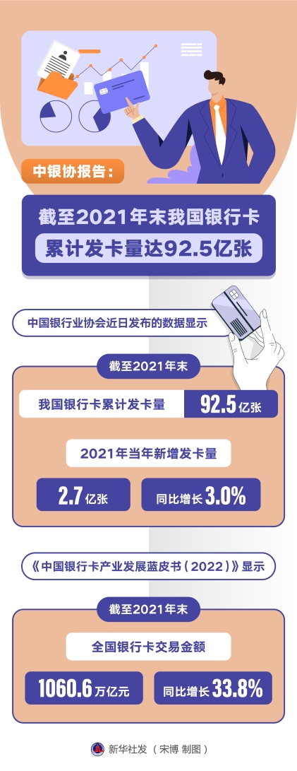 中國銀行業(yè)協(xié)會(huì)近日發(fā)布的數(shù)據(jù)顯示,截至2021年末,我國銀行卡累計(jì)發(fā)卡量達(dá)92.5億張,2021年當(dāng)年新增發(fā)卡量2.7億張,同比增長3.0%。