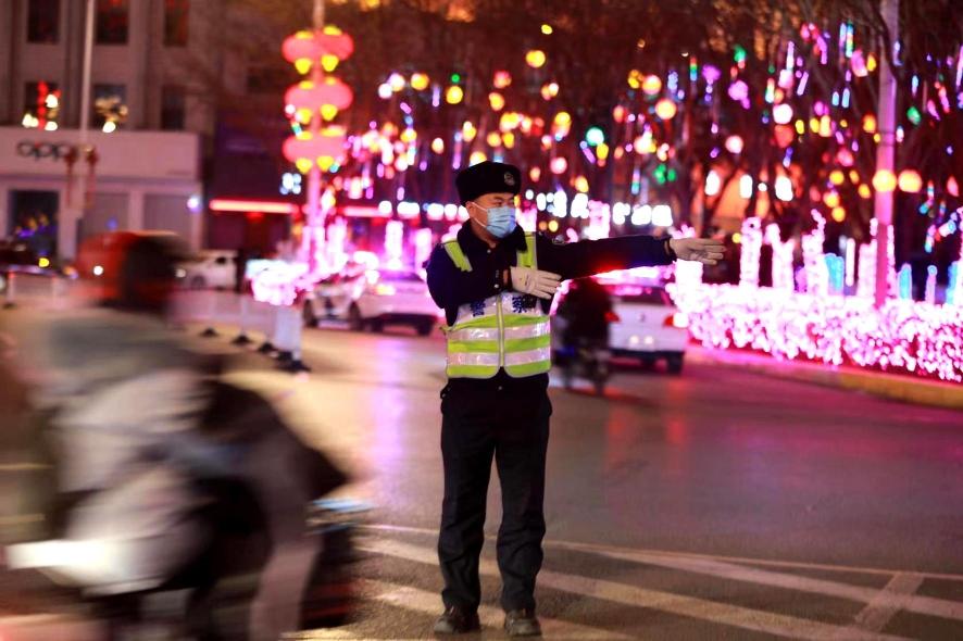 1月22日,大年初一,安徽省蕪湖市公安局交警支隊(duì)鳩江大隊(duì)民警在方特東方神畫(huà)景區(qū)堅(jiān)守崗位,確保游客安全有序觀賞燈展晚會(huì)。