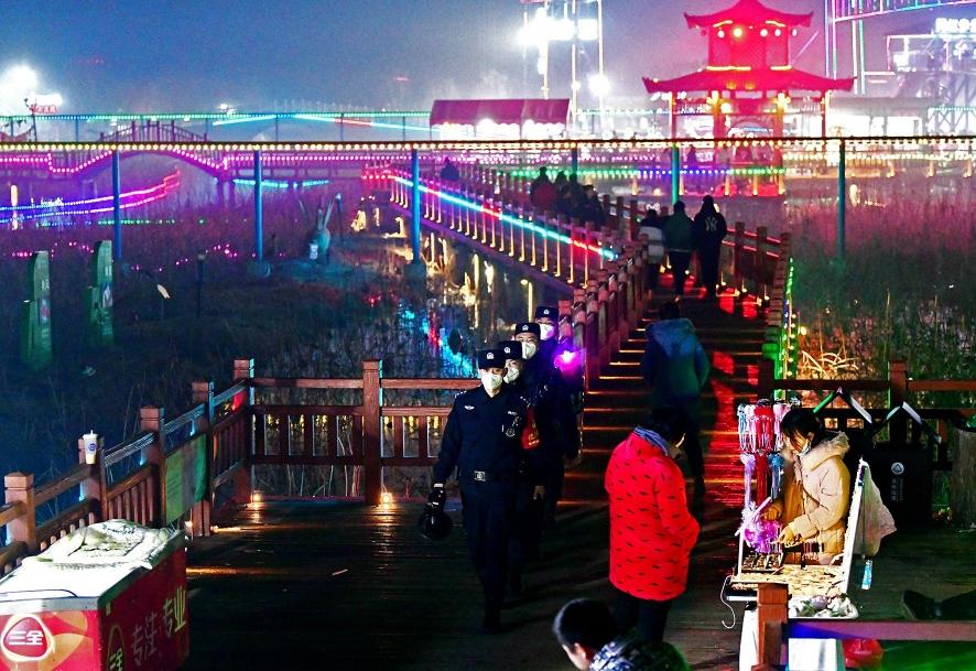 1月22日夜,安徽省阜南縣公安局巡防大隊(duì)民警在地城鎮(zhèn)楓柏崗風(fēng)景區(qū)巡邏。春節(jié)期間,阜南縣公安局組織警力在主要景區(qū)內(nèi)巡邏,保障群眾節(jié)日安全。
