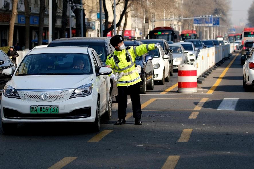 1月22日,天津市公安交通管理局河北支隊(duì)民警在中山路指揮疏導(dǎo)車輛。