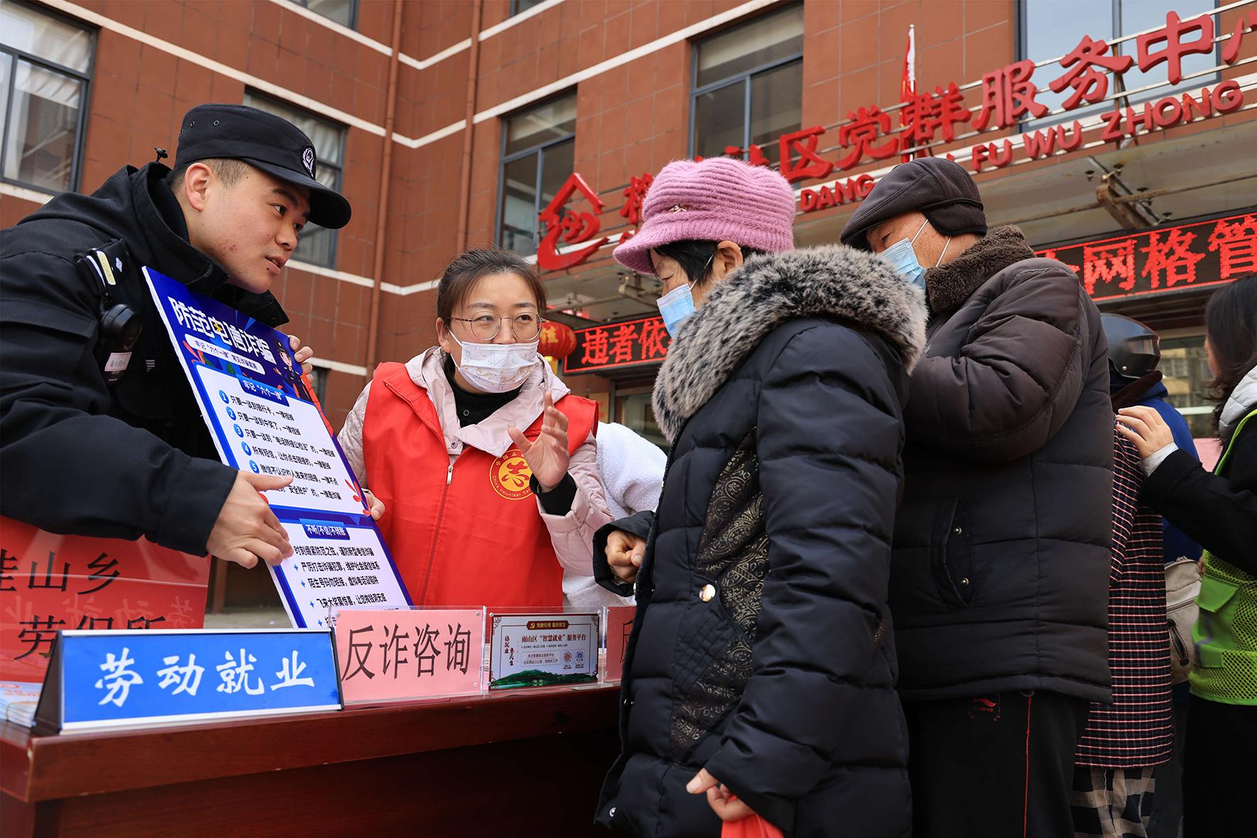 圖為民警與志愿者向現(xiàn)場(chǎng)群眾開(kāi)展普法、反詐宣傳。