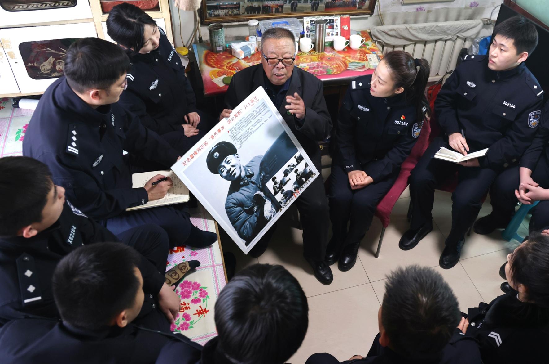 圖為民警認(rèn)真聆聽(tīng)老英雄講述抗美援朝戰(zhàn)爭(zhēng)中的英雄事跡。