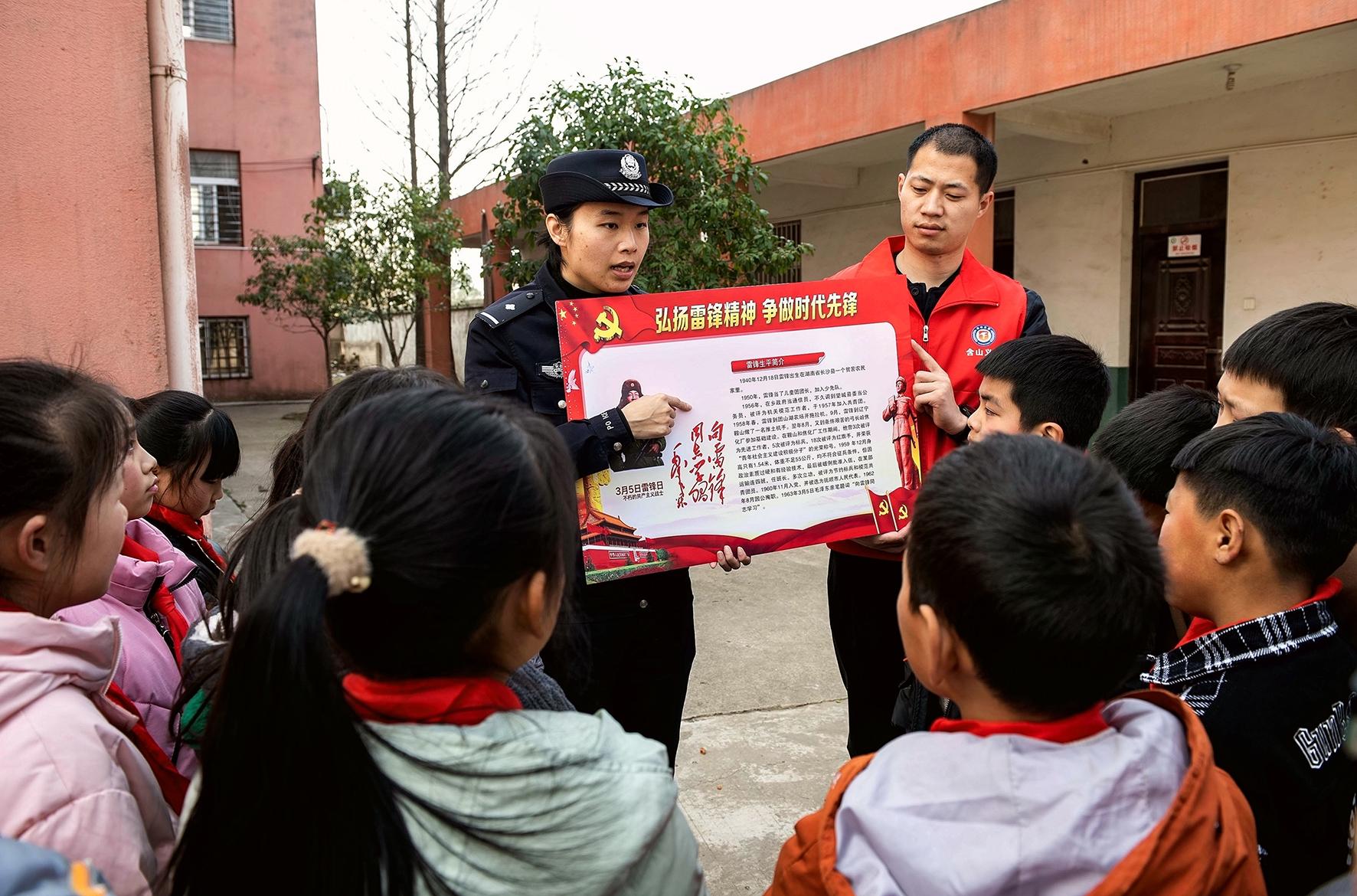 3月2日,安徽省含山縣公安局仙蹤派出所民警在姚廟中心學校,為學生講雷鋒故事。