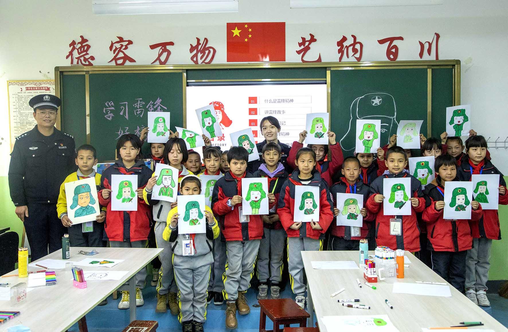 近日,新疆伊犁邊境管理支隊三道河邊境派出所民警走進(jìn)轄區(qū)小學(xué)開展“大手拉小手 一起畫雷鋒”活動。