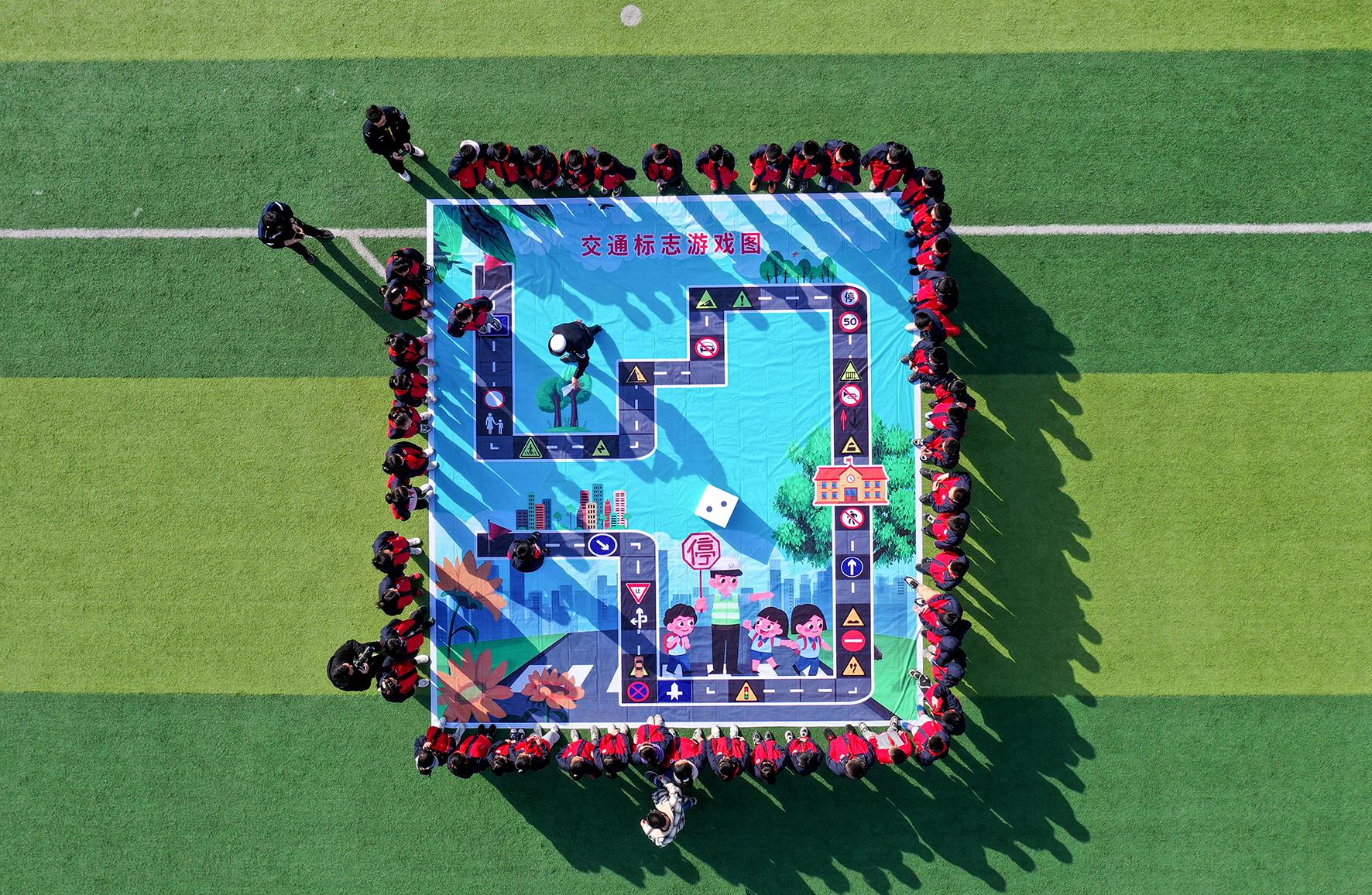 3月26日,安徽省阜南縣公安局交管大隊(duì)民警在黃崗鎮(zhèn)靳成學(xué)校與學(xué)生們互動(dòng)交通安全知識(shí)。