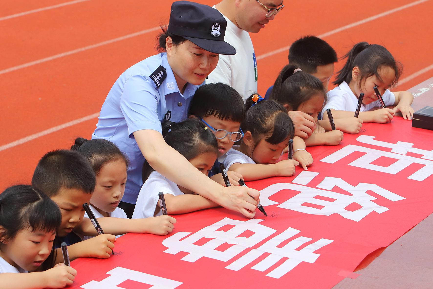 6月25日,浙江省臺(tái)州市公安局路南派出所民警走進(jìn)路南小學(xué),通過(guò)觀(guān)看禁毒展板、講述禁毒故事、“拒絕毒品”橫幅簽字等形式,對(duì)學(xué)生進(jìn)行禁毒教育。