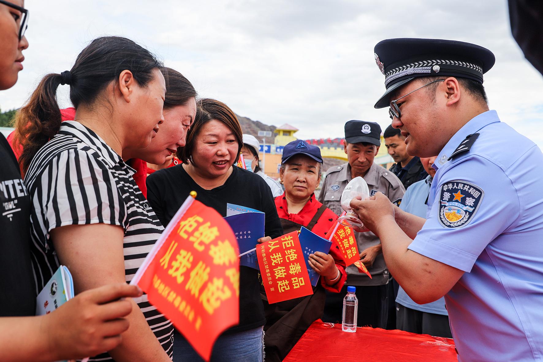 6月23日,新疆阿勒泰邊境管理支隊(duì)塘巴勒邊境檢查站聯(lián)合駐地派出所、海關(guān)、禁毒大隊(duì)等單位,在塔克什肯口岸商貿(mào)城廣場(chǎng)舉行以“健康人生 綠色無(wú)毒”為主題的禁毒宣傳教育活動(dòng)。