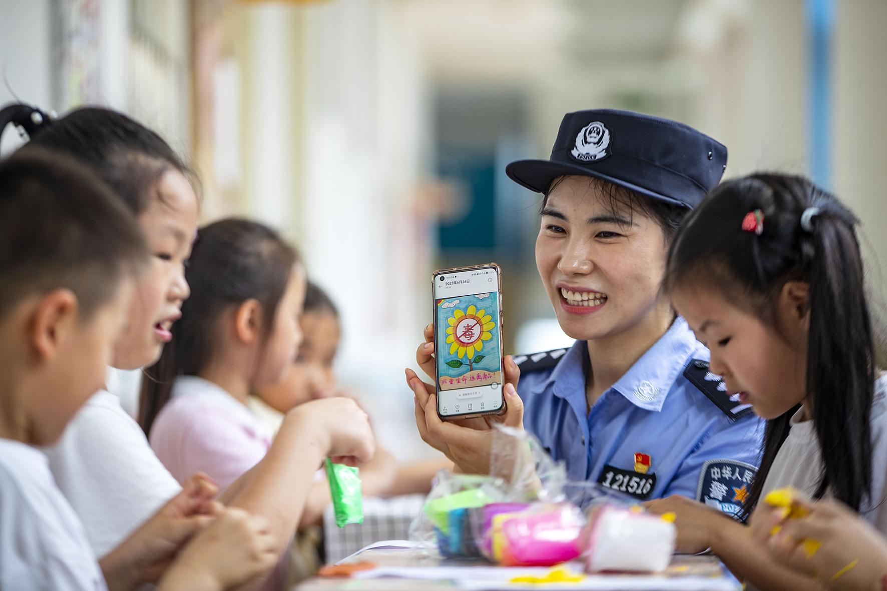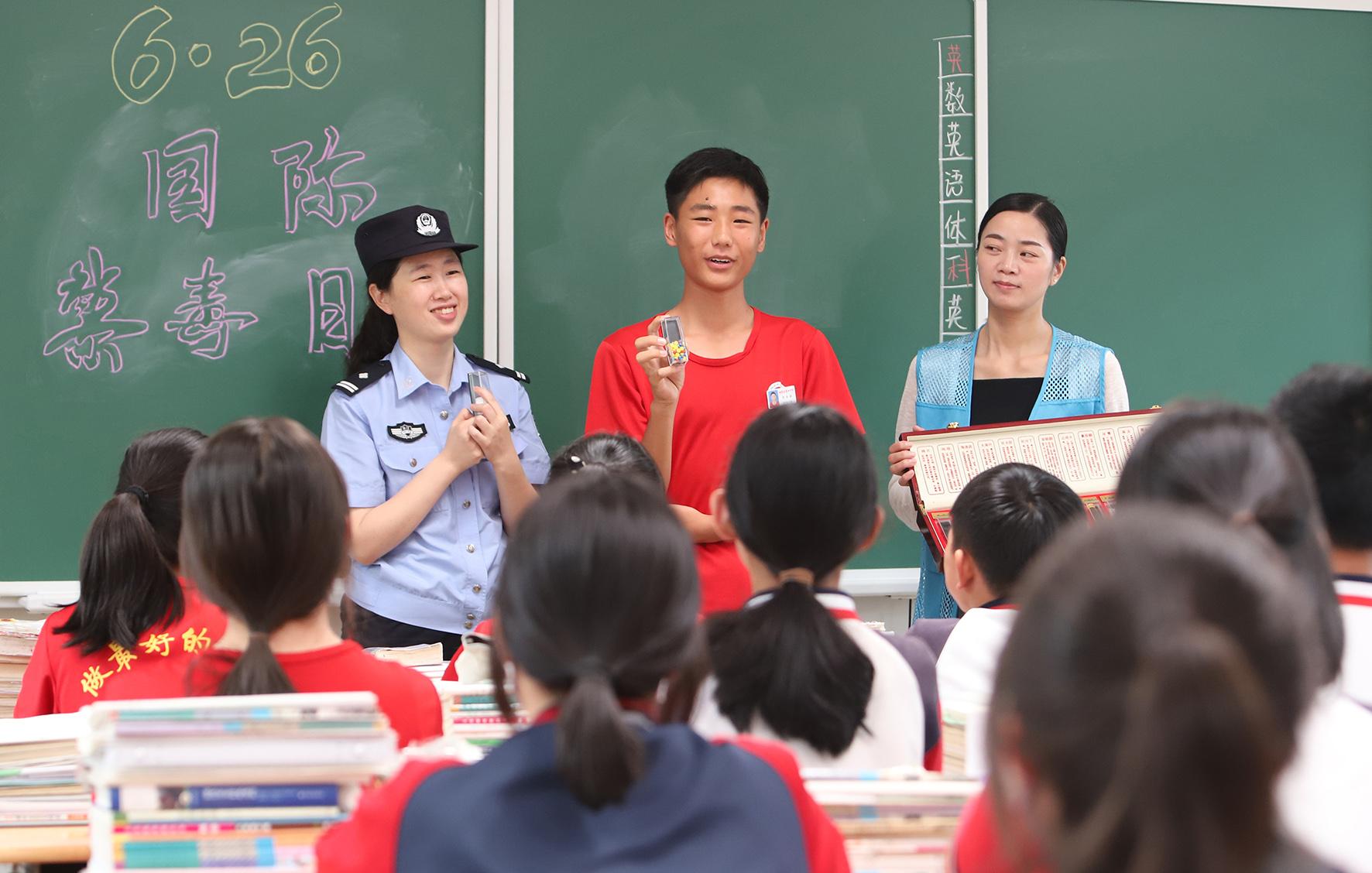 6月26日,安徽省當(dāng)涂縣公安局石橋派出所民輔警用仿真毒品樣本向?qū)W生講解毒品危害。